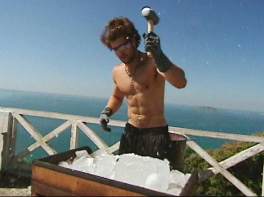 Of all the these cold challenges, this may be the only one where people opted not to wear a shirt. The goal of this challenge was not to melt ice, simply to crush it into small enough pieces to fit through a grid.
