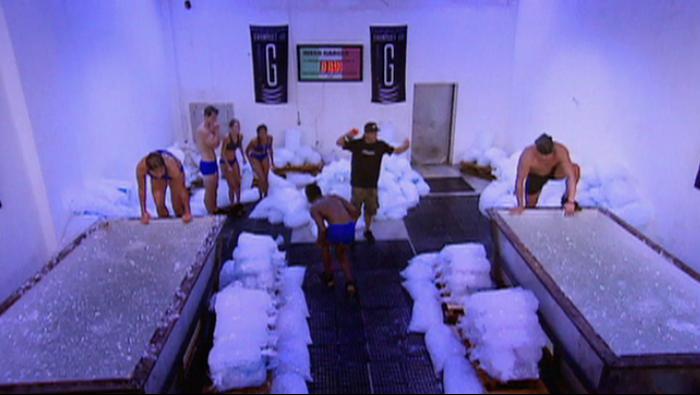 Think melting ice is easy? Think again. It took 16 people to melt the block of ice on this challenge. The guys turned themselves into human ice scrapers while the girls (or maybe just Tonya) resorted to heating up rocks with their mouths.