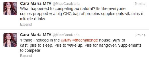 Interesting posts on Twitter from Cara Maria today. She seems awfully bitter at MTV and The Challenges and accused other cast members of relying on pills and supplements to enhance performance.