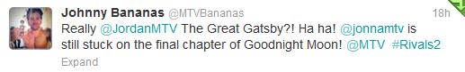 With Sarah out of the house, Jordan had no one to hook up with. Luckily, Jonna is on this season. So the two begin kissing in the club, then they get to talking. Jordan compares himself to The Great Gatsby because he’s so mysterious. Of course, Jonna does not understand this reference. I think Johnny sums of this exchange really well here:
