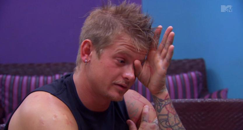 Another competitor from this season- Wes! He cried during The Duel after competing in a Duel with Derrick. He won, but was scratched up and overly emotional. Here, we see him crying as he talks to her girlfriend Johanna on the phone.