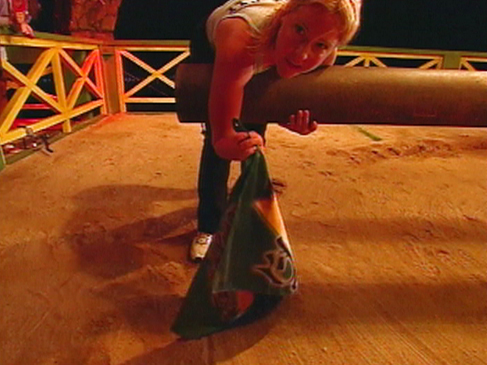 After a half-hour stalemate, Beth pushed herself to the flag. Frustrated by this, Svetlana begins to cry, jiggles the pole, then leaves the playing field to cry. As she jiggles the pole she causes the poorly attached flag to rip off of the carabiner. Then, but unclips the remaining portion of the flag while Svetlana cries.