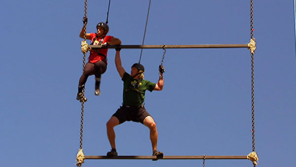 This challenge required duos to climb a 100 foot rope, but the catch was the fact that the distance between rungs increased as you progressed. This required partners to physically climb on top of each other to advance. For many teams, the 20 minute time limit wasn’t close to enough.