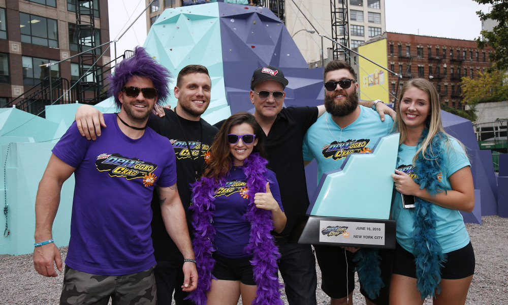 IMAGE DISTRIBUTED FOR MTN DEW - Original GUTS host Mike O'Malley, third right, DEWggro Crag host Chris Distefano, second left, and members of MTV's The Challenge, from left, Johnny "Bananas" Devenanzio, Camila Nakagawa, Chris "CT" Tamburello and Jenna Compono relive a 90s dream at the MTN DEW DEWggro Crag Powered by The Splat event, Thursday, June 16, 2016 in New York, as part of MTN DEW's DEWcision campaign. Visit DEWcision.com for more information. (Jason DeCrow/AP Images for MTN DEW) ORG XMIT: CPANY410