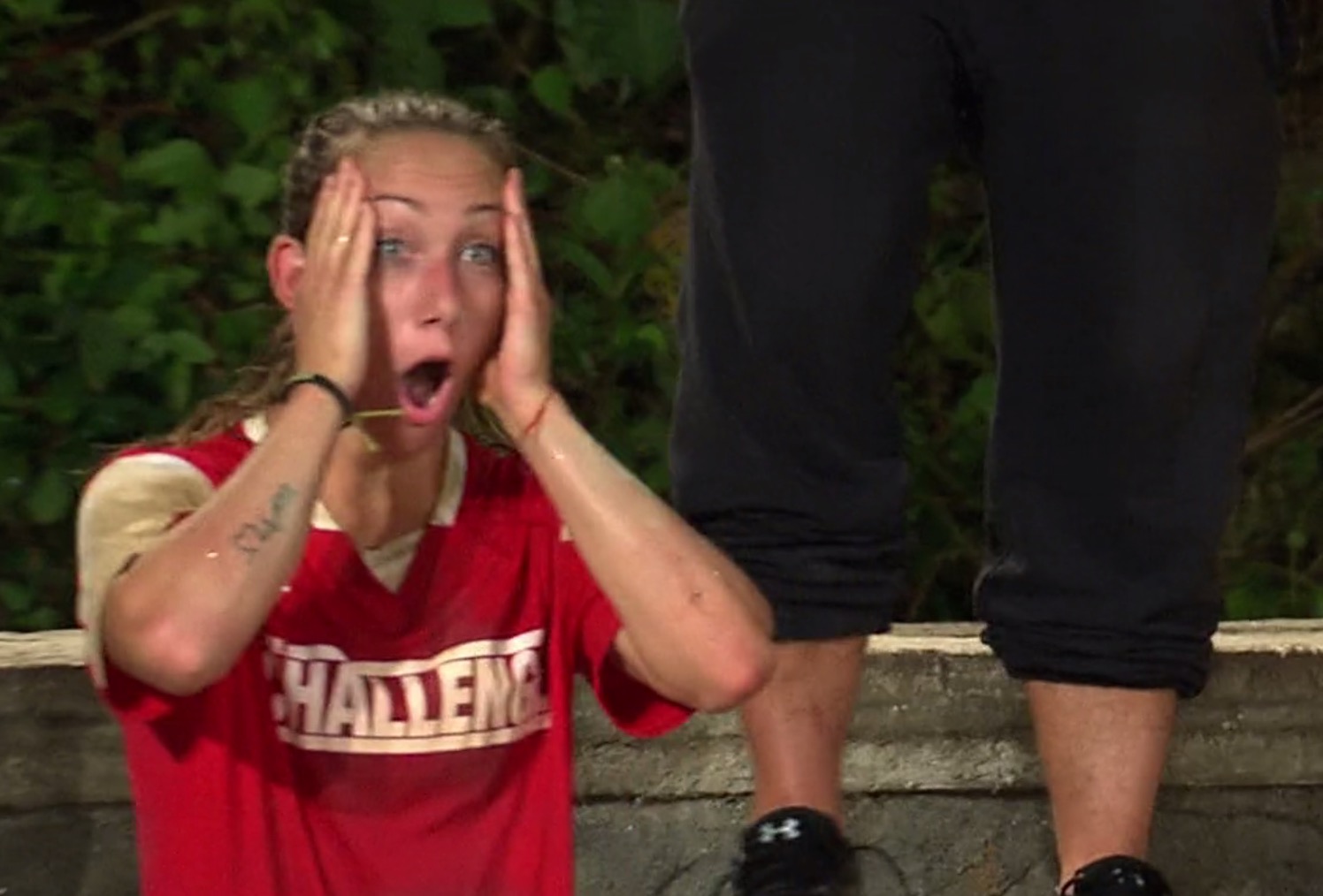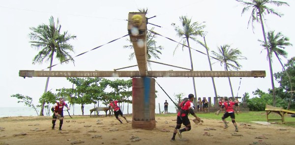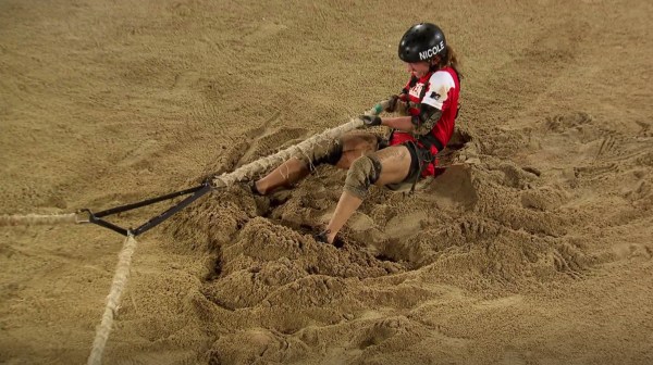 The cast shows up at The Fortress where the remaining Underdogs will be playing Inside Out. It’s a three-way tug-of-war where payers are harnessed to a ring in the center of a circle. The goal is to drag your opponents and ring your bell on the outside of the circle. The girls go first, and quickly exhaust themselves before anyone reaches their bell. Times passes and Nicole resorts to pulling her rope and reeling the other girls in. This works momentarily, but not enough for her to win. As the clock approaches on hour, Amanda and Ashley agree to work together. They pull Nicole until they’re half way between their two bells and then race to see who can ring their bell first. Ashley wins, and is guaranteed a spot in the final!