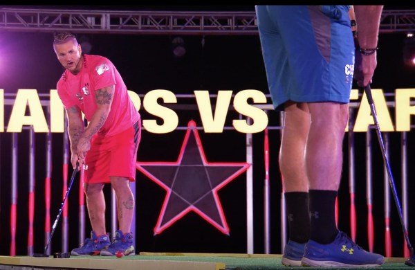 Elimination: Tic Tac Hole– Bananas vs. Riff Raff. Competitors must putt a golf ball into a hole, and once they do this they are able to place a disc into a “tic tac toe” board (really Connect Four). The goal is to get four in a row, which Bananas does and wins before Riff Raff even scored one point.