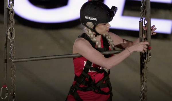 The elimination game is called Chain Reaction and involves competitors clipping and unclipping beams, connected by chains, to create a ladder. The first person to climb to the top and ring a bell wins. Melissa has more composure throughout this, so she wins and now has the power to launch a grenade on someone.
