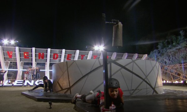 In The Ring, the Troika sends in Nelson and Britni to compete. However, we have a second batch of Mercenaries consisting of Frank, Darrell, Ashley M., and Laurel. The game is called Yanking My Chain and it’s reverse tug-of-war around a large cylinder and ring a bell. The first two matches are Brad vs. Frank and Ashley M. vs. Kam. Both Mercenaries lose to their Vendettas opponents, and Brad and Kam both earn grenades and the chance to stay in the game.