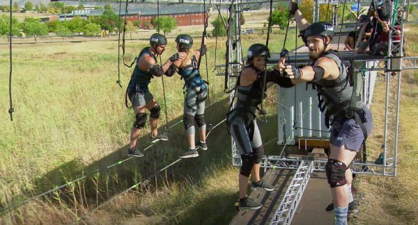 The challenge is named Off the Rails and competitors music work together in unison to cross an obstacle course consisting of a balance beam and a rope course. The catch? This course is on top of a moving train. Throughout the course, there are four lifelines, dangling ropes for support. The huge advantage Kyle & Brad won last episode is the ability to remove a rope from a competing team. They ultimately choose to take a lifeline away from Cara Marie & Marie, prolonging the ongoing drama between Kyle and Cara Maria.