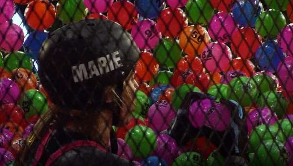 The Redemption game is called That’s the Ticket. It’s places one competitor in a lottery drum and the competitor must find five specific balls with their lucky numbers on it. The other teammate will be spinning their opponent’s drum, making it as difficult as possible to deposit their lucky numbers. The first heat is played by Kam & Kayleigh and Cara Maria & Marie. Both Kam and Cara Maria do a good job of spinning, but Cara Maria figures out how to change tempos to throw Kayleigh off balance. This works, and Marie is focused enough to get her five balls. Surprise! Marie finally wins something!