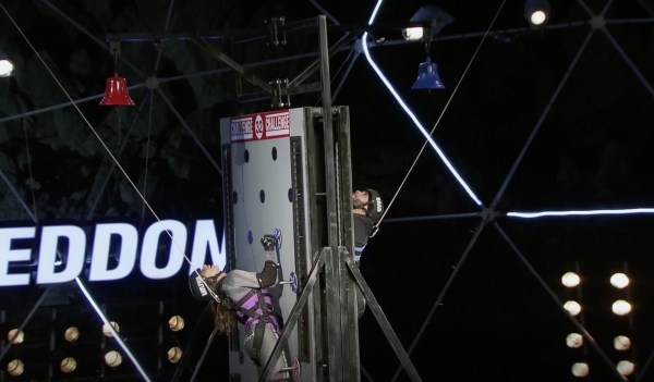 Brad & Kyle face Kam & Kayleigh in I Got You Pegged. The goal is to place 16 pegs in a wall, climb the wall, and ring a bell. However, there are numbers on the pegs and they must add to 32. Kam takes control has the adder while Brad, who was an accountant and has taught math, wants to climb because he can add by looking at the wall. There’s no denying that Brad is faster, but Kam lays out all of the pegs to ensure she has the correct 16 that will add to 32. While Brad rings the bell first and Kayleigh is a much slower climber, Brad’s attempt is wrong. Kayleigh benefits from Kam’s strategy and get the win.