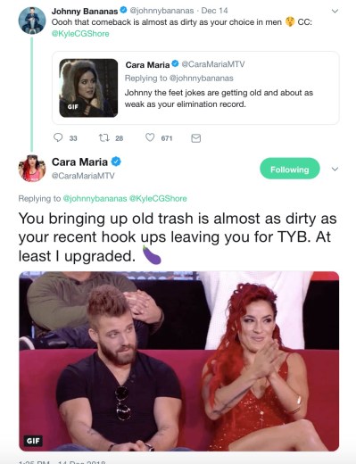 • Cara Maria tweets to Bananas, saying his jokes are about as weak at his elimination record.