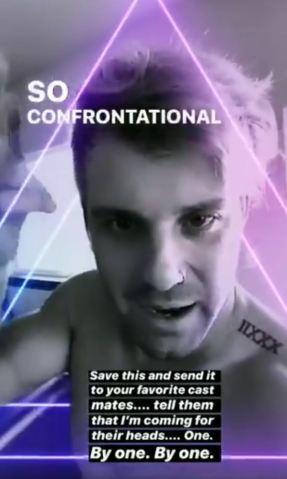 Last last week, he posted an Instagram video with the Papa Roach song “Getting Away with Murder,” and the captions “Save this and send it to your favorite cast mates… tell them that I’m coming for their heads…… One. By one. By one.” In the video he just nods around and signals a gun shooting with his fingers.