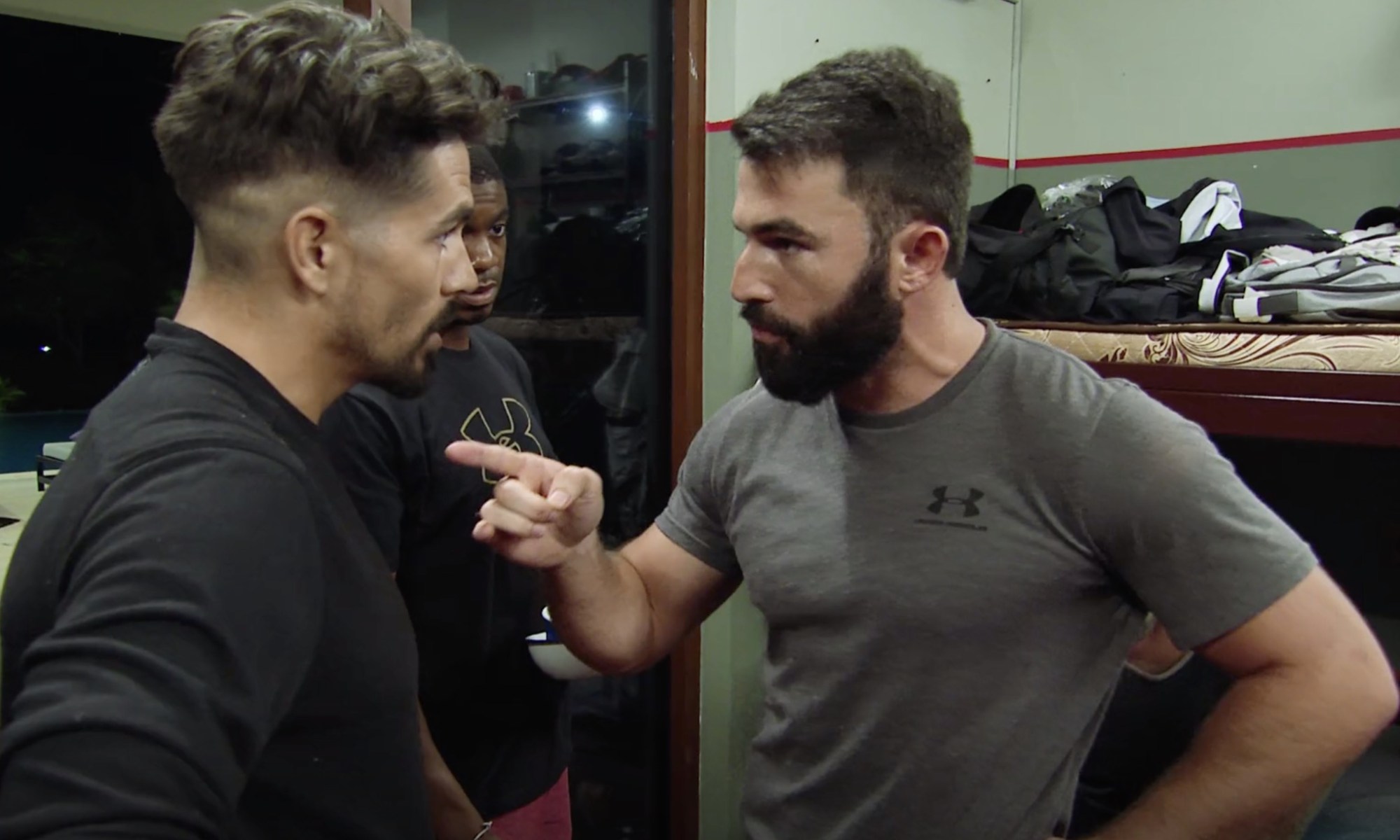 Bored, Theo decides it’s time to pick on Paulie for entertainment. Essentially, this is a dick waving content where Theo claims to be the stronger and could beat Paulie in a fight. Then Paulie gets in Theo’s face, but no one is really fighting. Theo brings up the fact that Kyle slept with Cara, but Paulie brags that he took another man’s woman. It’s all pointless, and once it looks like the two might actually fight and they’re face-to-face, Paulie basically kisses Theo in a very odd fashion .