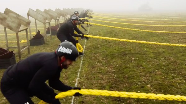 Bananas, Rogan, and Josh in a rope pulling challenge.