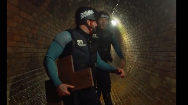 Kyle dropping into a sewer, Rogan behind him. Fessy, Jenny and Nelson to the right.