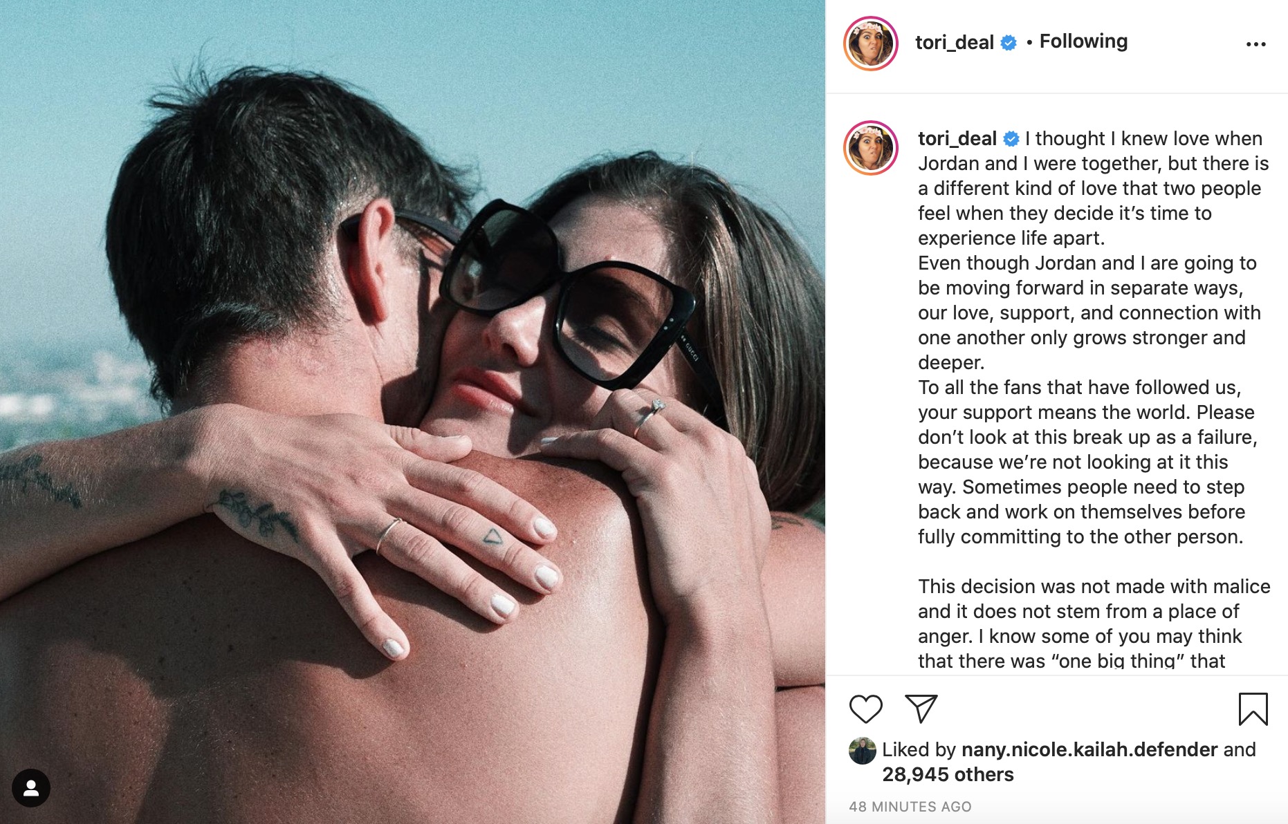 It seems they are both upset, but remain respectful of each other. They ask fans do the same. At this point, Tori liked Jordan’s post but Jordan did not like Tori’s post.