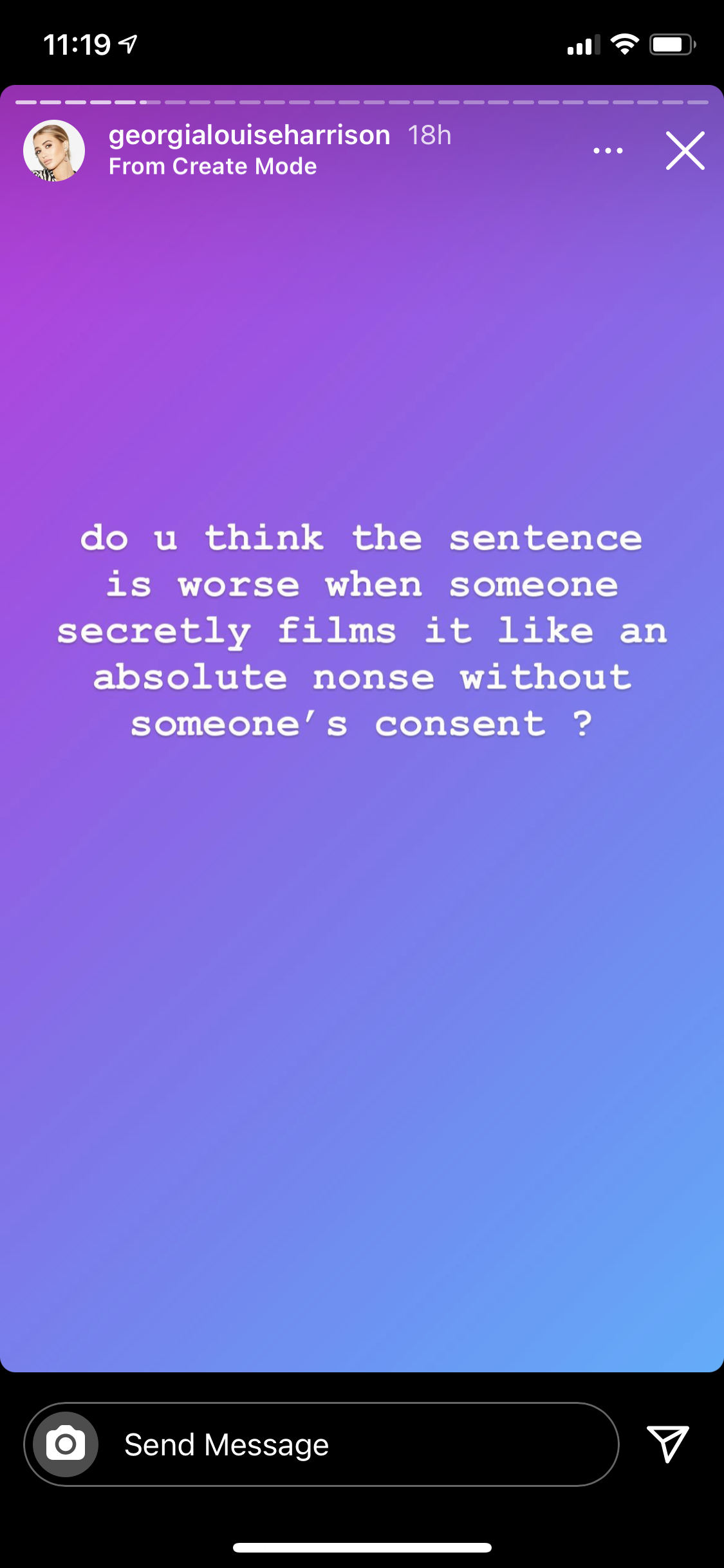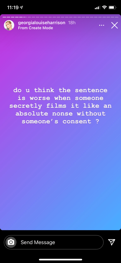 Georgia began her series of stories asking for hypothetical advice, questioning if it’s OK to share such a video and stating this incident is worse because the video was filmed without her consent.