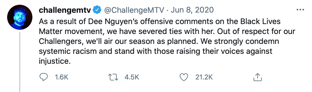 I’ve been a viewer of MTV for over two decades now. I was very aware of their response to the Super Bowl in 2004, and I’m aware of casting initiatives for The Challenge. It feels MTV is slowly changing casting and trying to be more inclusive, but they’re unwilling to acknowledge their role creating an environment where racism and misogyny can flourish.