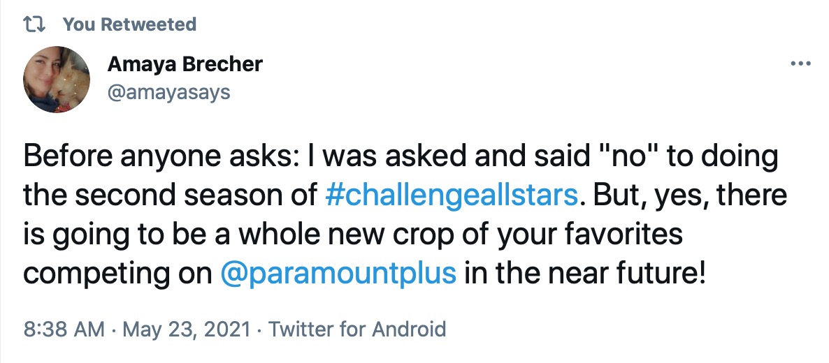 Amaya from Real World: Hawaii posted on Twitter claiming she was asked to do the show. Sadly, she declined. While she might not have been the most intense competitor, she was always fun to watch.