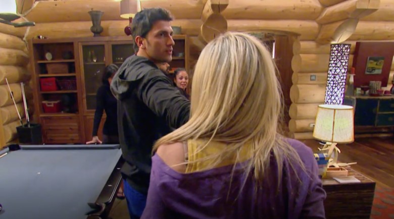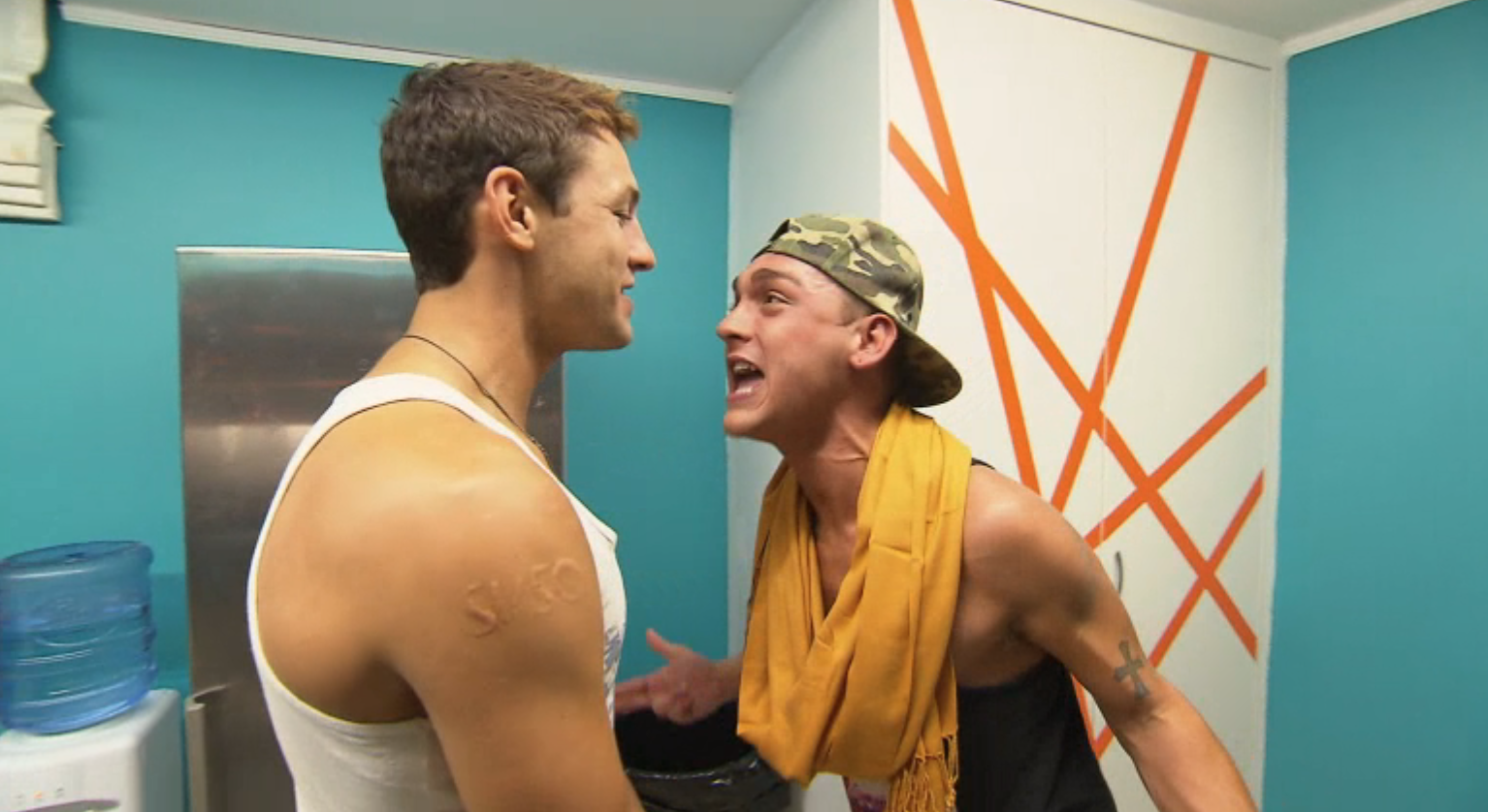It’s hard to assign blame here, because Bananas did try to tar and feather Derrick while he was sleeping using craft feathers and maple syrup. Derrick kept all of his family pictures by his bed, so he was mad at Bananas. He jumped on top of Bananas, tried to wrestle him, but was held back by Evan. During the process Derrick shoved Evan and threw a bottle at Bananas’s head, but can we really feel bad for Johnny here?