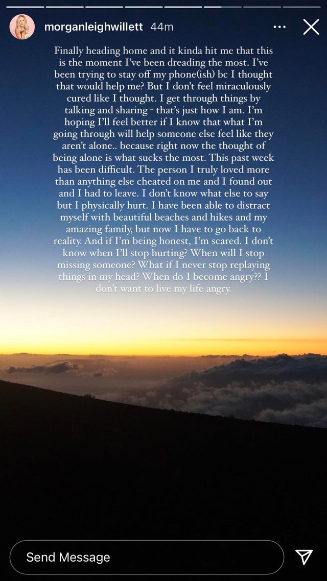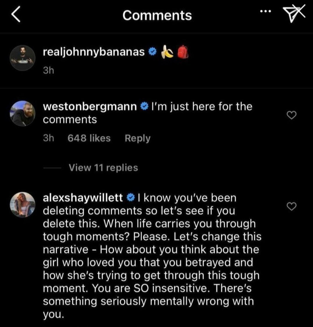 Edit #2: Alex Willett, Morgan’s sister, is chiming in. She’s further confirming that Bananas cheated and shouldn’t portray himself as a victim.