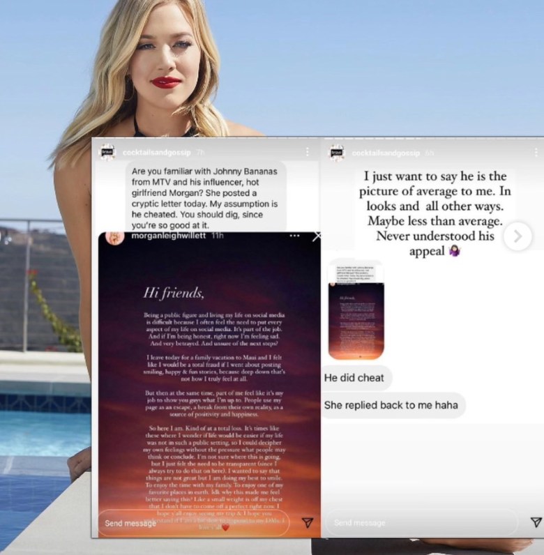 However, there is a screenshot of a private message between Morgan and a fan where she acknowledges that Bananas did cheat, and this is why she’s feeling so bad.