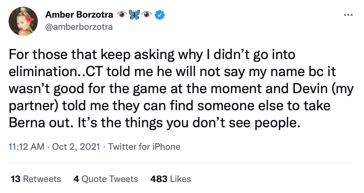Leave it to Uncle CT to keep Amber safe! It would have been pretty badass if did go into The Lair and take out Berna, but eliminations are always chancy. CT forced Amber to make the most secure play, and it likely bought her two weeks of safety.