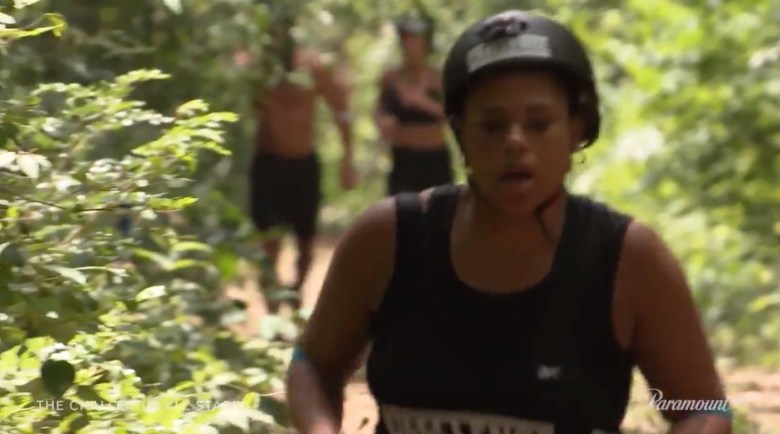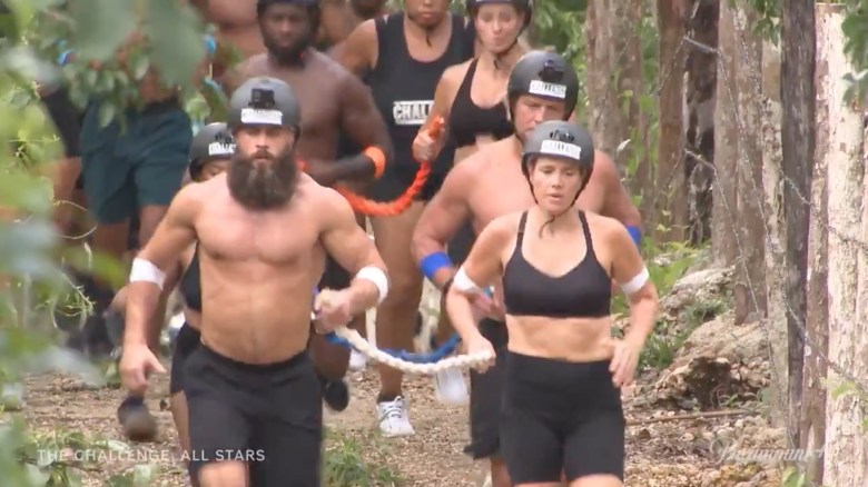 A Black male (likely Darrell based on the tattoos) pulling a rope in elimination.