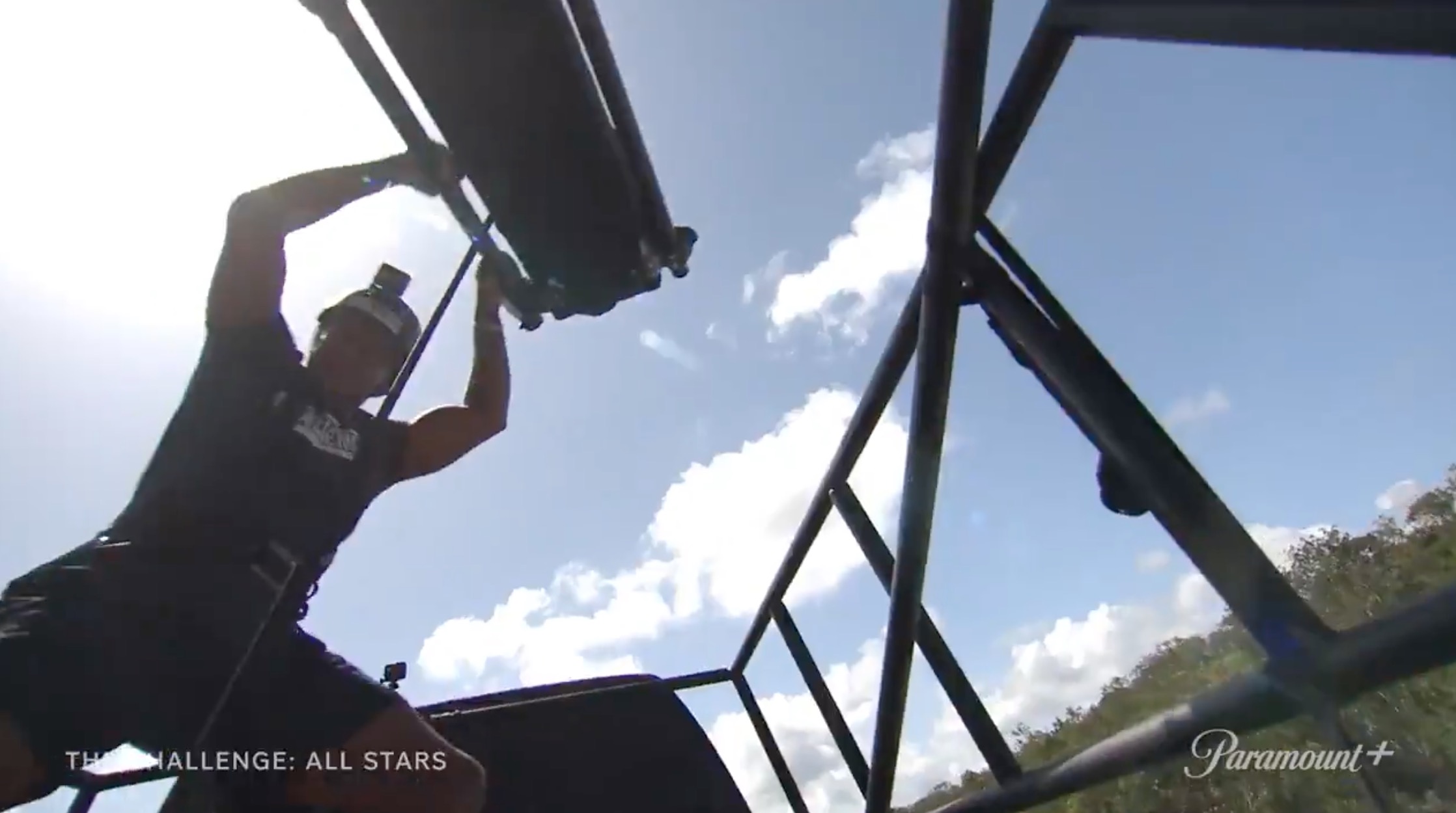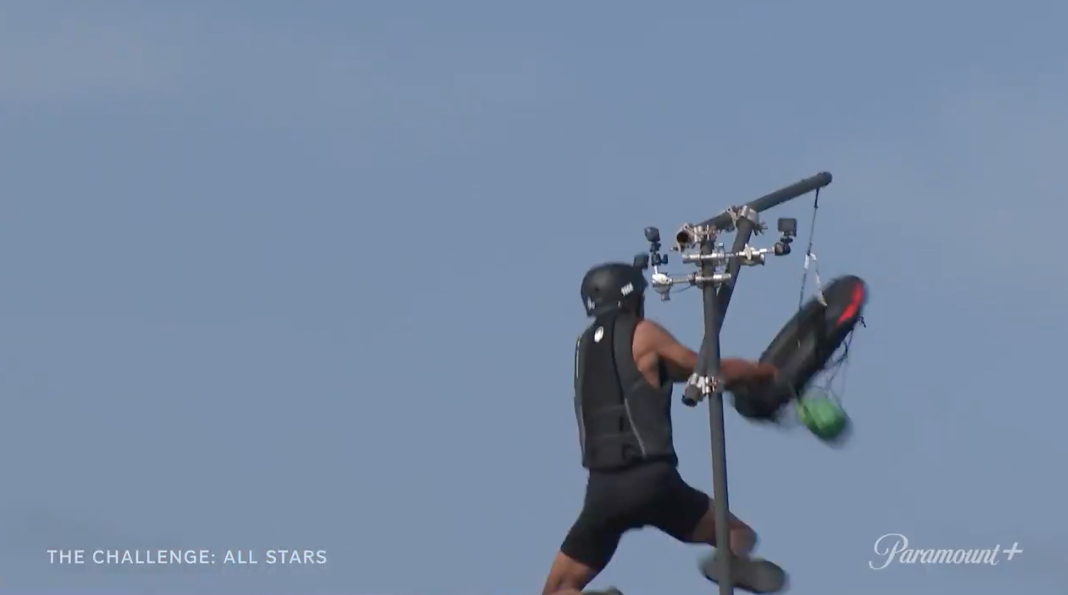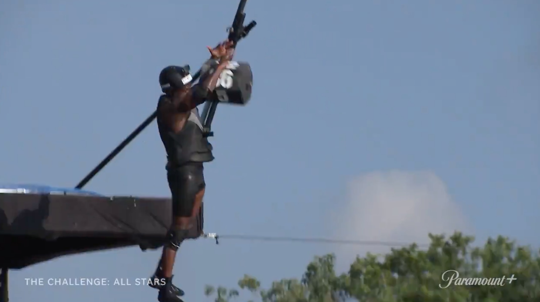 A Black male (likely Darrell based on the tattoos) pulling a rope in elimination.