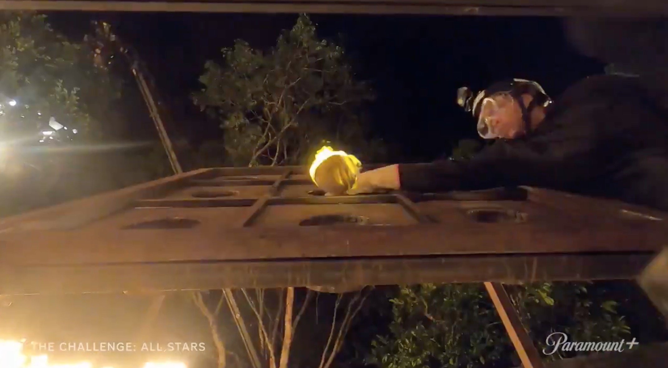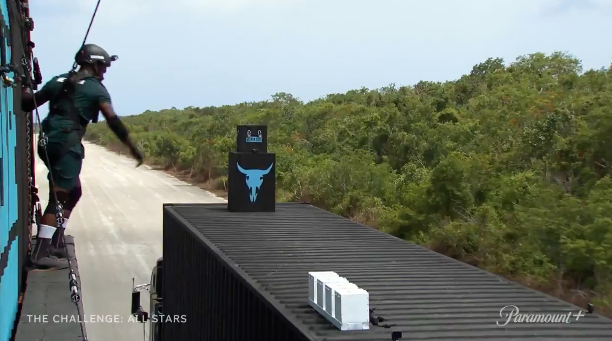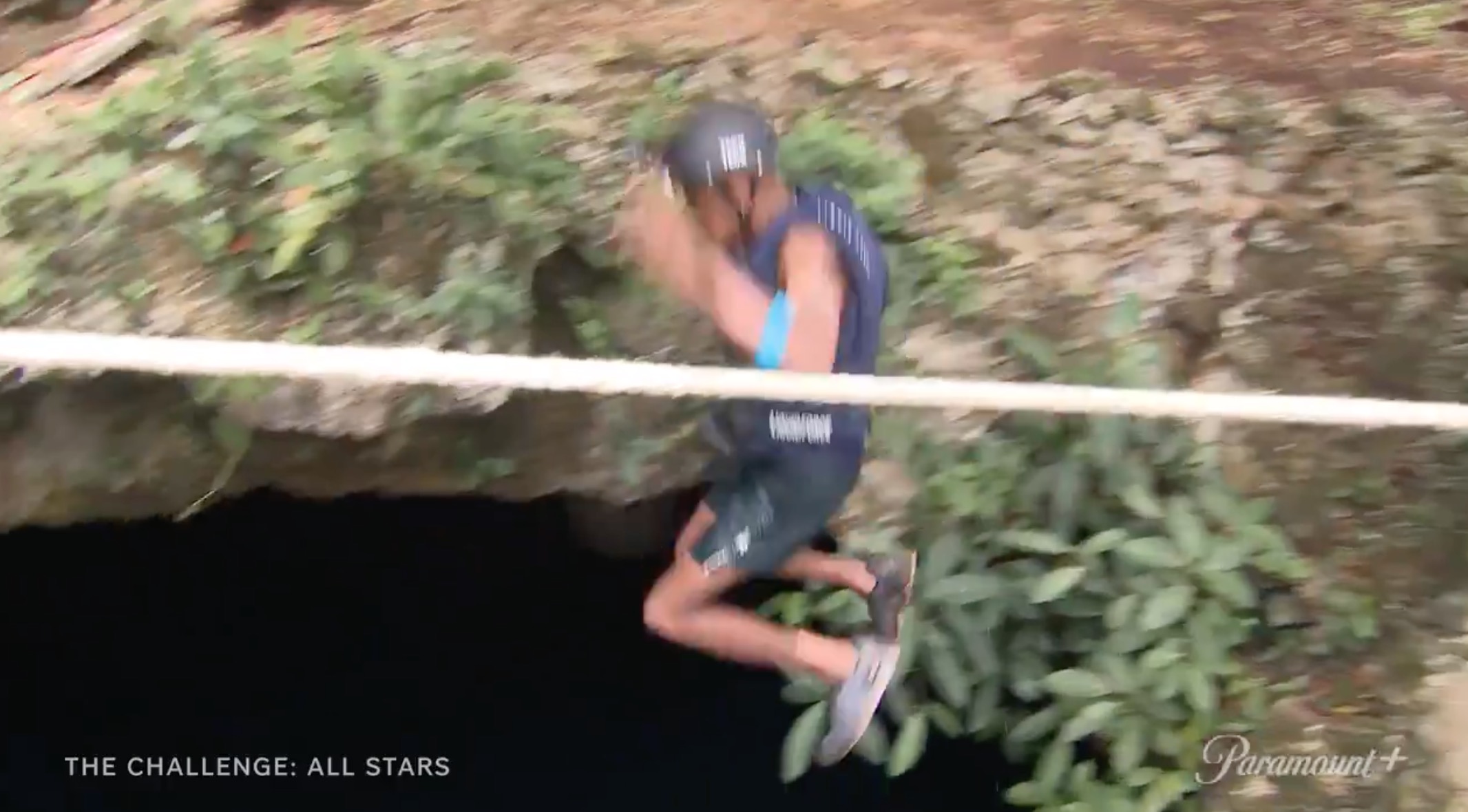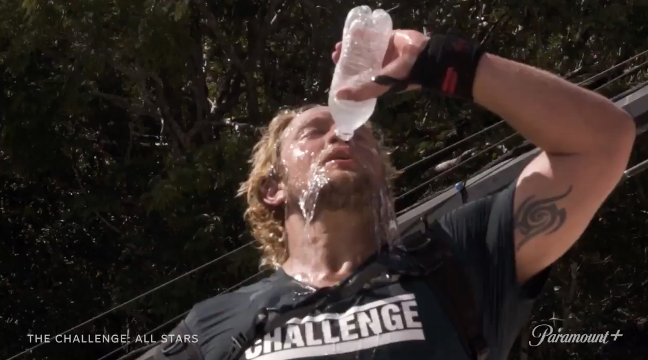 A Black male (likely Darrell based on the tattoos) pulling a rope in elimination.