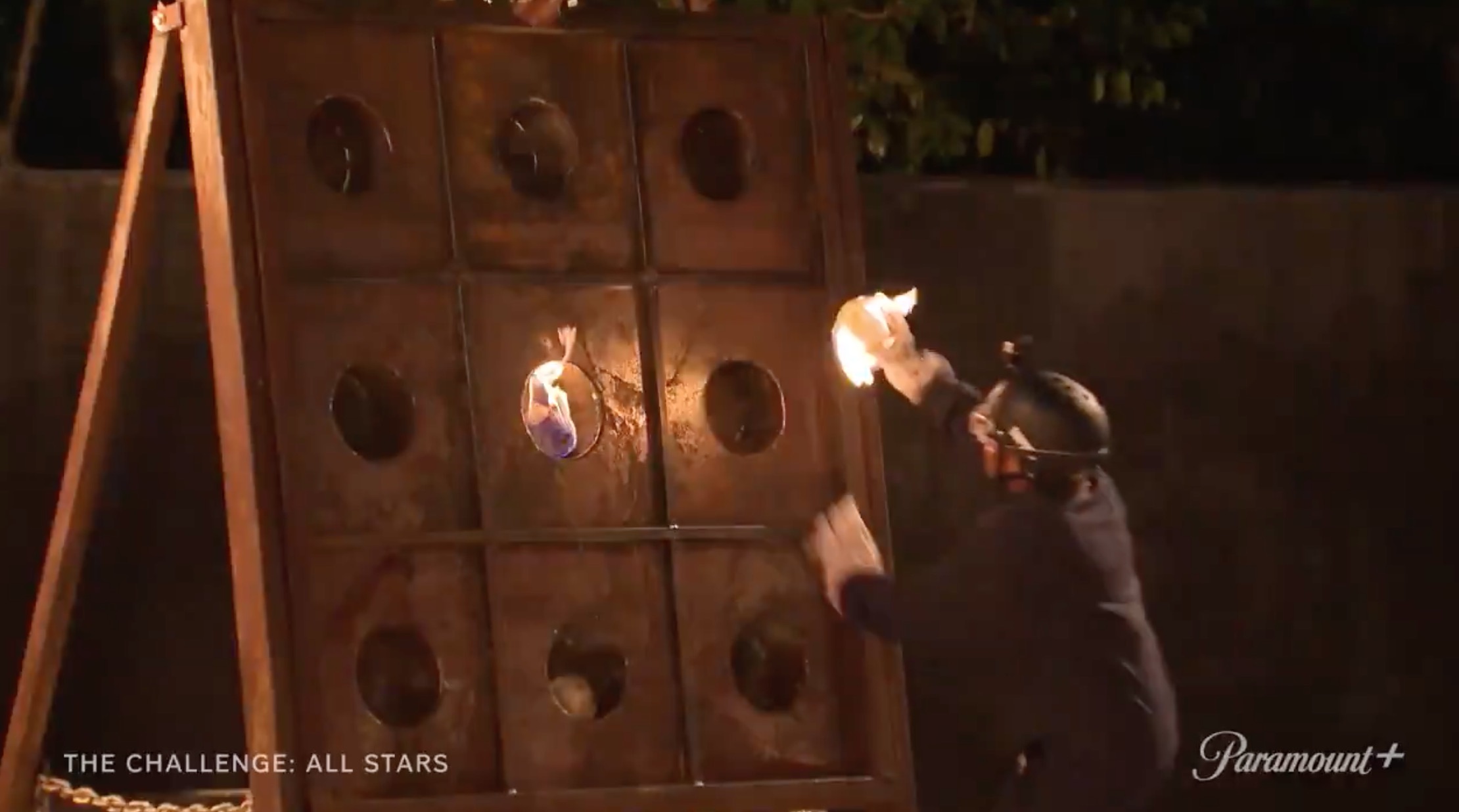 An elimination where players need to put flaming balls in a wall. Here is Ayanna.