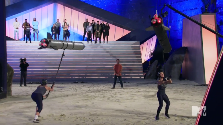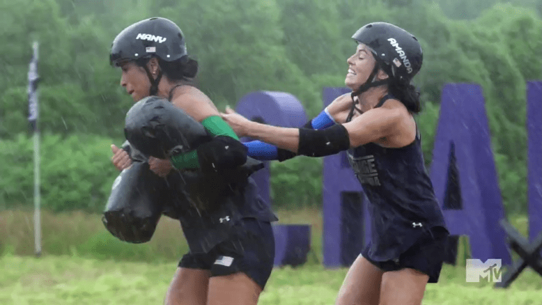 The cast shows up for a very special mission. It’s going to take place on the 500th episode of The Challenge. The mission is called Brush Contact and it’s a headbanger! It’s formed around two traits central to every spy: invasion and deception. First, the men must run bags of money across a field and relay them to the women. Then, the women take the bags and bring them to the end zone where they’re banked. The bags contain either $1,000 or $3,000, making the maximum score $10,000. While one team plays offense, another team will play defense. In the first heat, all the men on the emerald team bypass Kyle and CT. Then, the women need to run. Kaycee and Tori cross the line, but Nany is taken down by Amanda. She tries to get up, but her bags fall out of bounds. Emerald totals $8,000 banked. The sapphire heat goes second, and CT immediately runs $4,000 out of bounds, so they can’t win. In the final heat, Nelson and Cory deposit their bags. Logan throws a bag to Cory, and Cory catches it in the “safe zone.” But, money cannot be transferred in the safe zone and it’s a $3,000 bag. So, ruby can’t win either. This means emerald wins again.