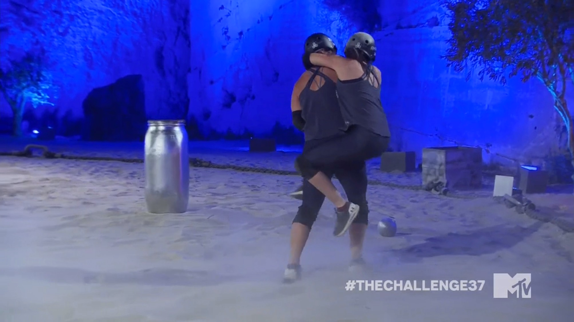 Amanda and Tori are playing Drone Drop, and it’s basically the same thing as Drone Ball Drop from War of the Worlds. A drone flies out, drops a football, and the competitors need to get it into their goal. Score twice and you win. Amanda proves she’s scrappy in the first round, and she tackles Tori to the ground while trying to get the ball. But, Tori has moves. She flings the ball and grabs Amanda’s leg. Now, she’s carrying Amanda to the ball. Amanda doesn’t fight until Tori tries to pick up the ball, but it doesn’t matter. Tori gets the first goal. The second heat is an easier battle for Tori. Amanda tries, but Tori gets the ball quickly, scores her second goal, and wins.