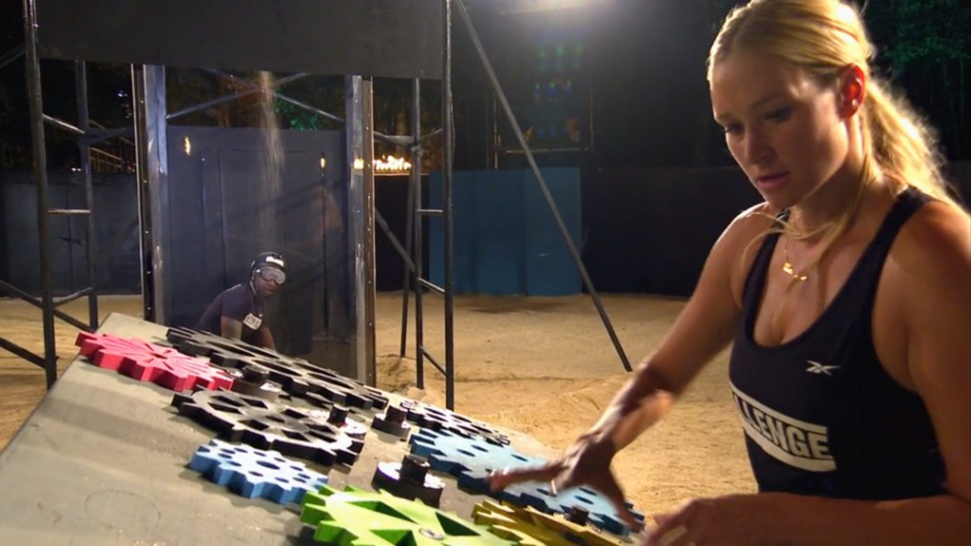 The mission is called Dive & Conquer and it’s akin to Logged Out from Battle of the Seasons and Don’t Forget About Me from Exes 2. Cast members need to jump into a cenote, memorize a puzzle, and reproduce it on a puzzle board. It’s an exhausting race to run laps and see the answer key. Of course, Jonna played both similar games and she has a strategy. Memorize one color at a time, accept the fact that she’ll be running laps, and get it done. This works, because she wins with MJ.
