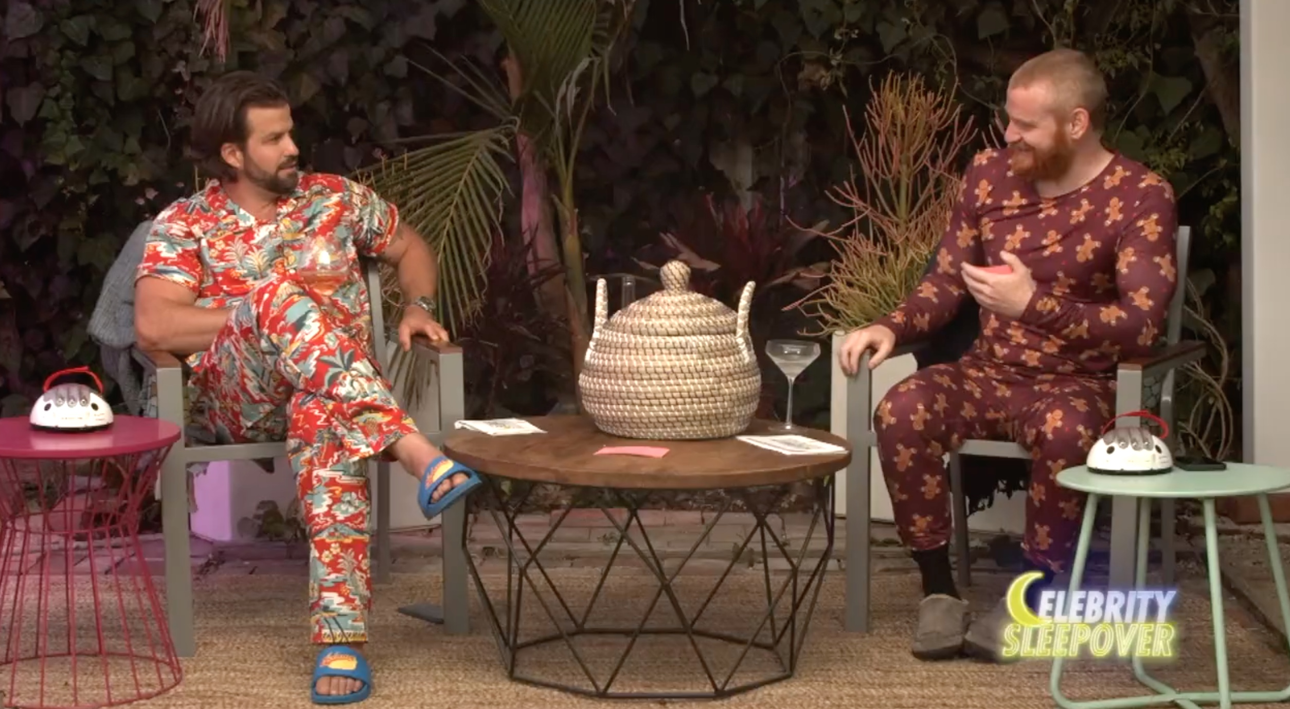 Of course, the late-night show has the host and guests in their pajamas. Wes is covered in gingerbread men and can be seen in the same slippers he got on Total Madness. Bananas looks like he’s on a cruise with his toes showing.