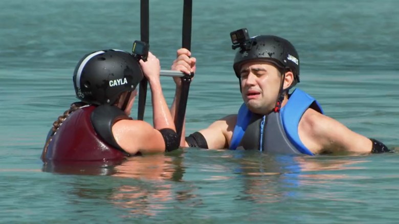Once again, James finds himself in a sticky situation. At the Yeah Buoy challenge, he hits the buoy too hard and flops around in the water in pain. This prevents him from getting a single word on the board, but he recovers fast enough to throw some names under the bus prior to elimination, including Tiffany and Cashel, the two who are selected for elimination, and he manages to defeat them despite a slower start.