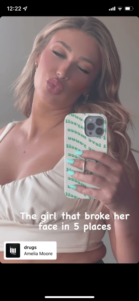 So, why is Olivia so interesting? In the last picture she posted the captions “the girl who broke her face in 5 places.” If you zoom in above her nose, between her eyebrows, you can see some damage, though she does a good job masking it with makeup. Apparently Olivia got hurt throughout the season because a golf ball hit her in the face. And it was a bad injury, production was worried.
