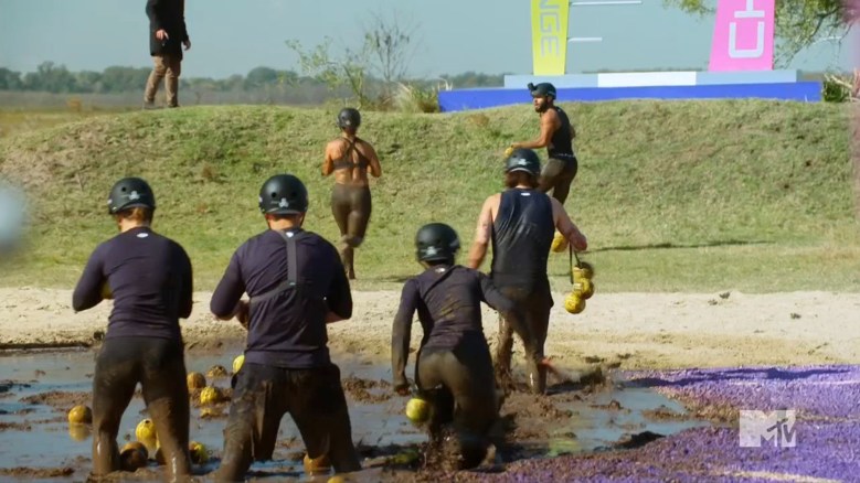 The first mission is called Bolas of Blood, and the cast needs to answer questions about their teams. If they really know each other (and basic arithmetic), they’ll be able to answer easily. Then, they run into the mud and collect bolas with the digits that answer the questions. First team to get all three answers right will win, and Johnny & Ravyn take the victory.