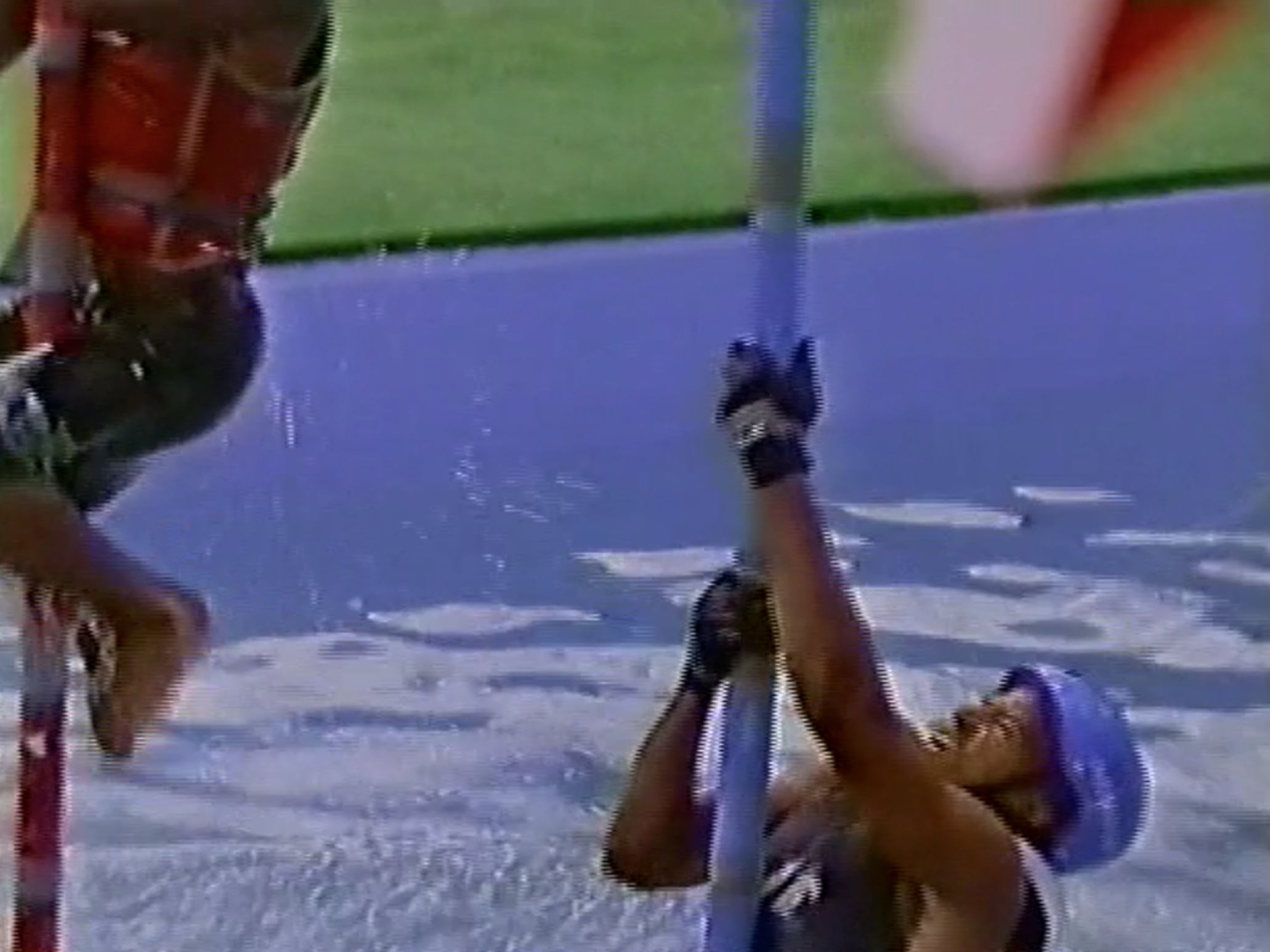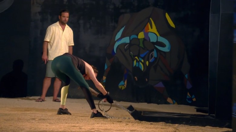 Similar to Nany in Strung Out, Big T had plenty of time to beat Aneesa. Not that Big T was fast, but Aneesa made no progress whatsoever. She just sat there tied to the beam, waiting for Big T to inch to the end.