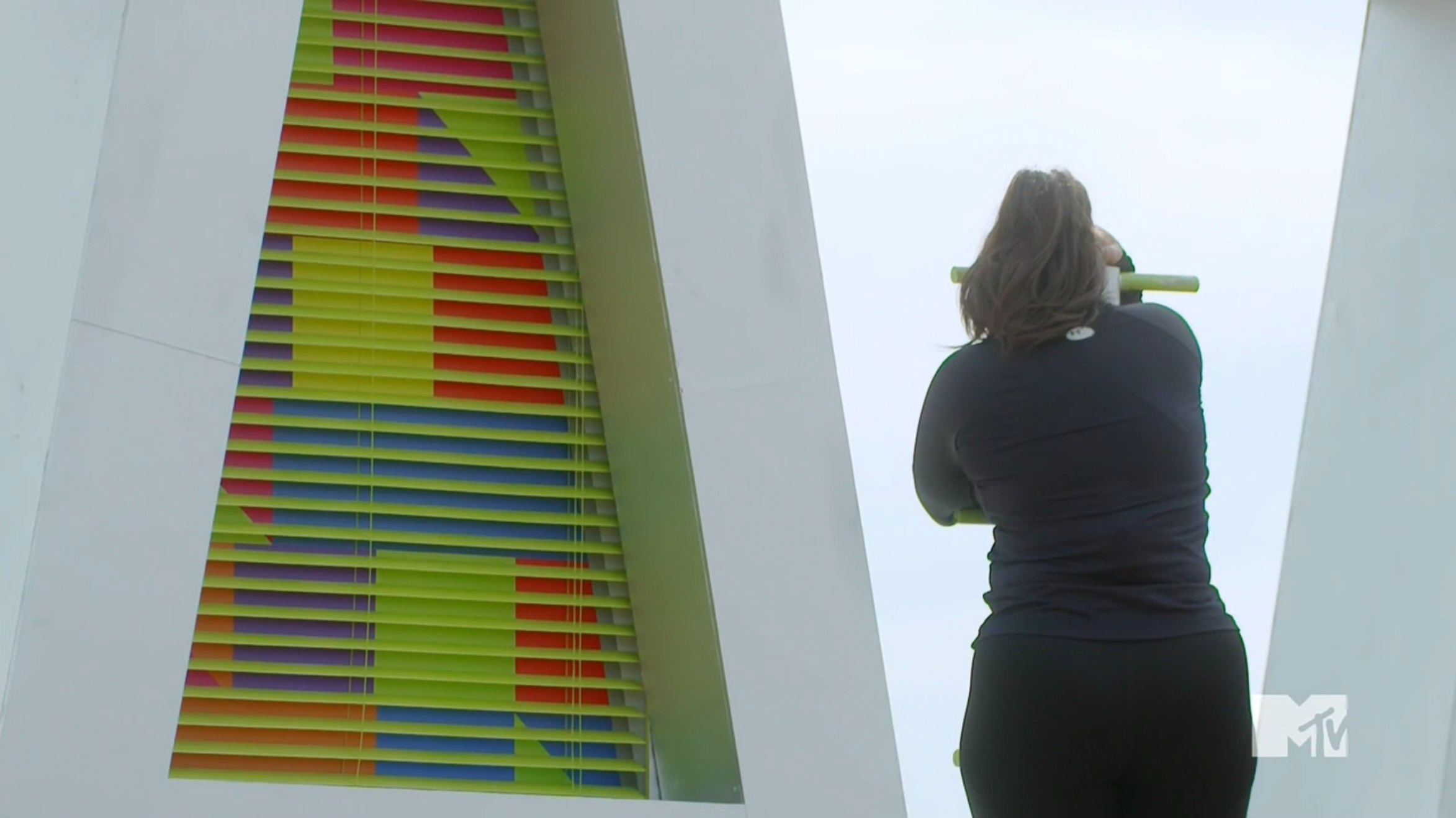 The challenge is called Peaking Blinders, and it’s a memory puzzle. One partner balances on a thin beam that will open window blinds when it’s being stood on. The other partner will memorize the puzzle, but once the balancer falls, the team must run to a second board and recreate the color pattern. The process will repeat until one team has successfully reproduced the puzzle. Some teams have memory strategies, like Nelson & Nurys and Devin & Tori, while other teams have different strategies. Veronica and Aneesa decide to