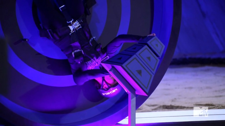This elimination puts one player inside a wheel to roll it back and forth like a hamster, and the other player is strapped to the back. They need to complete a pyramid puzzle that moves four pieces from one side to the other across three stations, but one piece can’t be stacked on top of a larger one. Jay claims he figured out the puzzle as soon as he saw it, and Olivia doesn’t grasp the rules immediately, but there’s a twist: the audience can get loud. So, they scream directions for Horacio & Olivia and scream so loud Jay & Michele can’t communicate. This derails Jay & Michele’s game, and allows Horacio & Olivia to win.