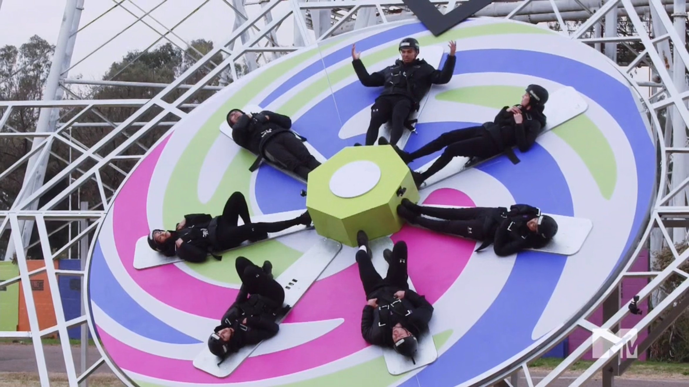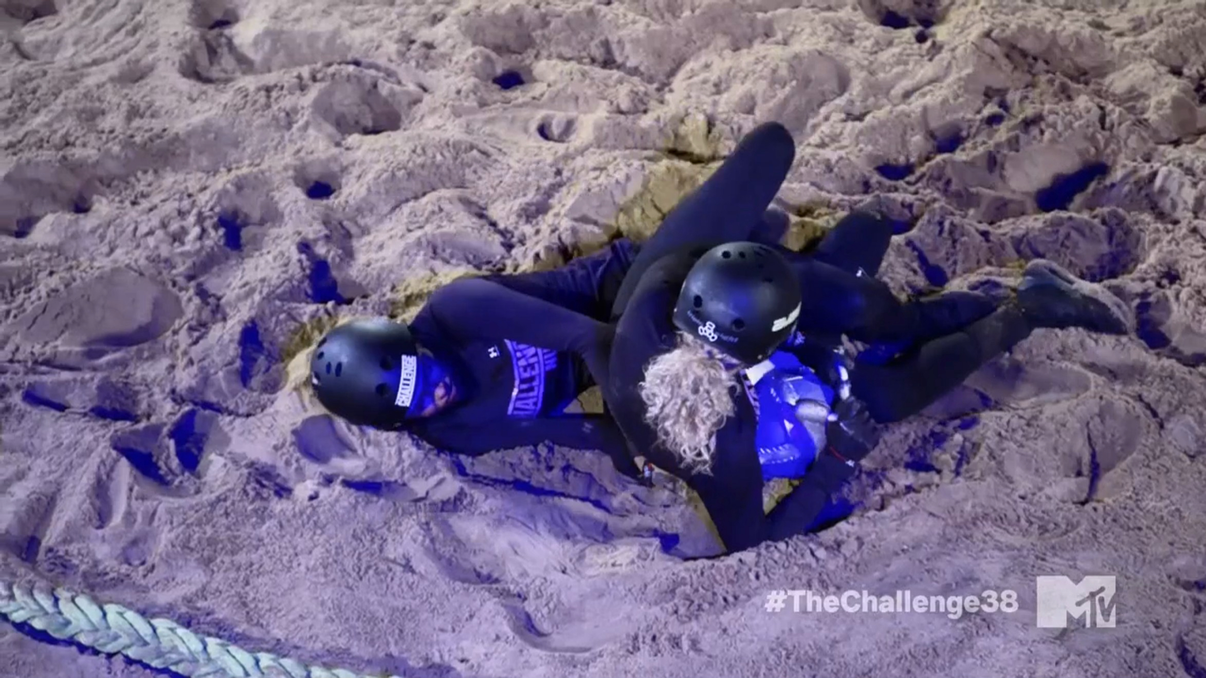 The Challenge is called Spin Class, and teams are harnessed into spinning wheels. TJ pulls a lever to spin the wheel and the competitor who it lands on will need to answer a trivia question. The first team to answer five questions correctly will win the challenge. Answer wrong? Your team is spinning for 30 seconds. It’s the green team (the one assembled by Moriah) against the orange team (the one assembled by Faysal). Devin gives the team a pep talk, but they don’t seem to know anything — Jordan can’t even spell Aneesa’s last name. At one point, the orange team has a three point lead, but Nurys and Moriah answer their trivia questions correctly, helping to close the gap. Apparently, Kaycee doesn’t know Adam and Eve, and the orange team starts to slip. The teams are tied 4-4, but Bananas wins for the orange team by answering a math question correctly.