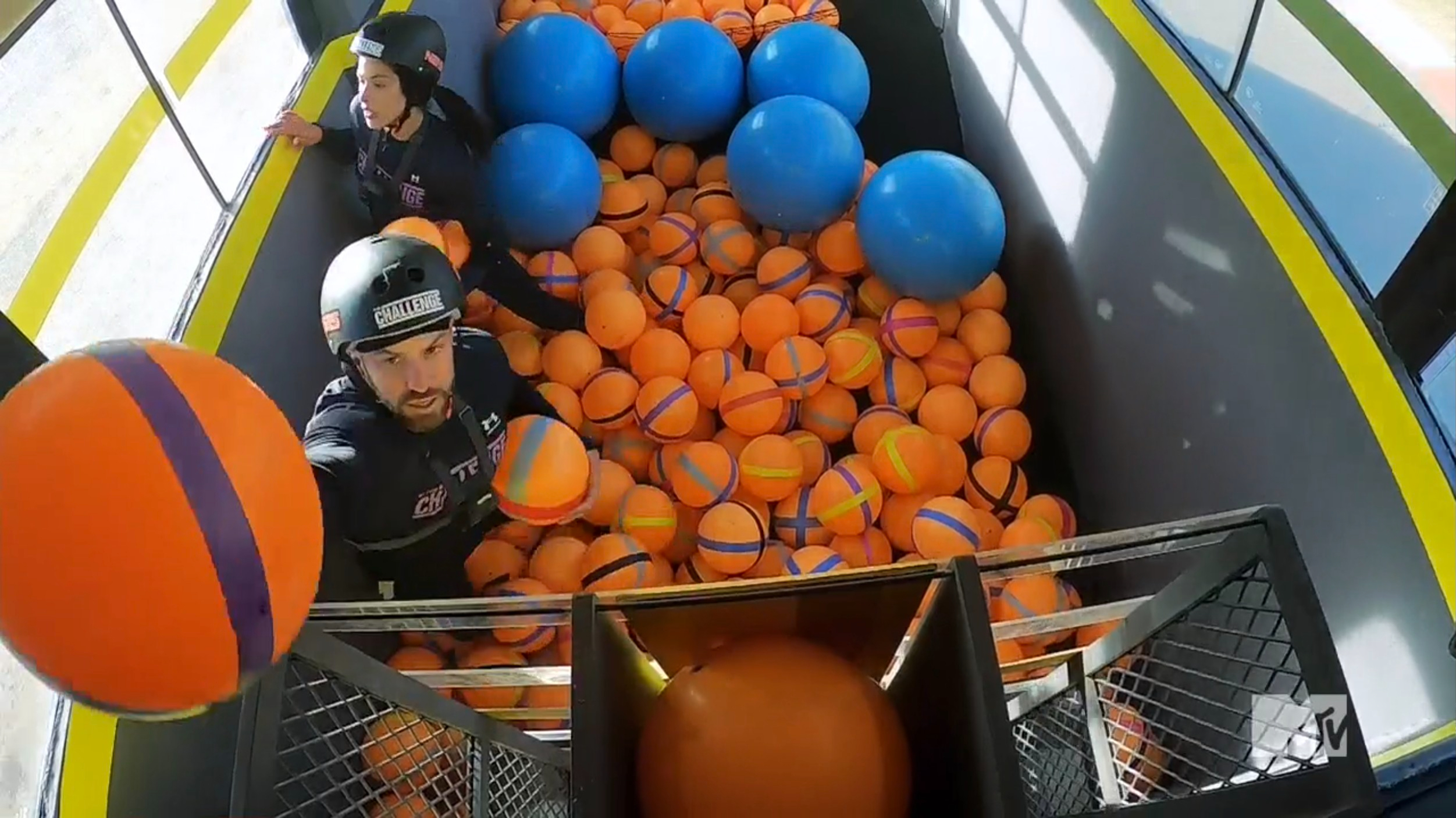 The cast shows up for the Challenge, and TJ emerges from a bus. It’s called Runaway Ride and inside the bus is over 100 balls. One at a time, teams will enter the bus that’s navigating an obstacle course. They’ll need to look out the window and memorize an answer key that has marked balls on it. They’ll need to find the corresponding balls in the bus and recreate the pattern. Whichever team gets the most balls correct the fastest will win. Amber & Chauncey go first, and they quickly realize they’re on unstable ground. They eventually get sick and pull the lever to stop their time with only 7 out of 10 balls. Then, Olivia and Horacio go, and they move much quicker.