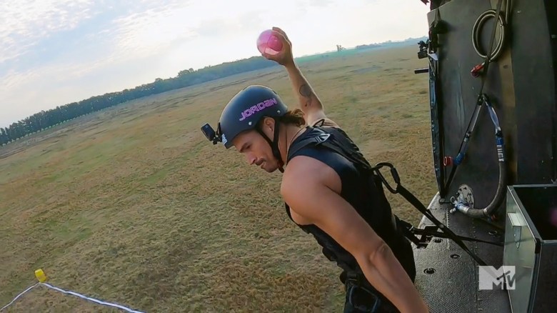 The pairs wake up, and they meet TJ at a helicopter. The teams are going up, and they’re given chalk bombs to throw at targets. Because they finished in third, Jordan & Aneesa get 15 balls, Devin & Tori get 20, and Bananas & Nany get 25. Devin & Tori go first, and they hit 10 targets. Then, Jordan & Aneesa go and Aneesa decides to give Jordan the majority of the chalk bombs, but the duo only gets 6 hits. Finally, Bananas & Nany go, and they also hit 6 targets. So, Devin & Tori emerge as the winners and they’re given the power to determine the order teams are released at the next stage. Of course, they choose: Devin & Tori, Jordan & Aneesa, then Bananas & Nany.