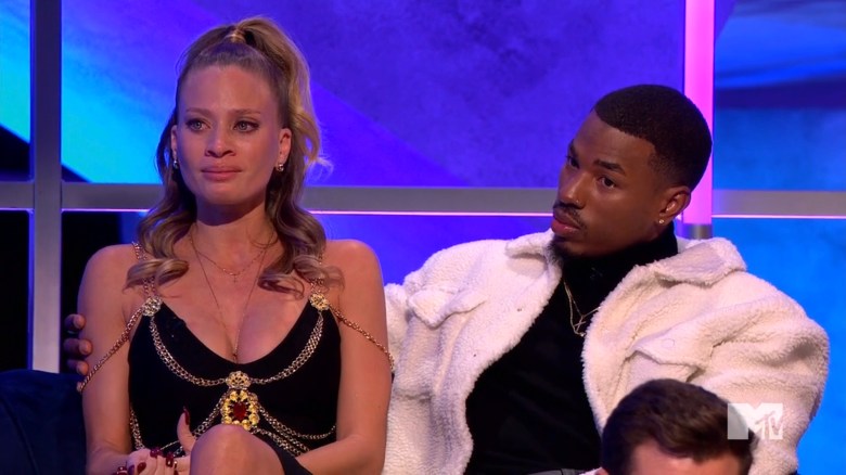 We start with positive news — Amber is pregnant. Then we get a series of questions: Aneesa agrees that Jordan pushed her, but not too hard, and Jakk agreed that Laurel can be abrasive, but he can take it. Then, we see some heat between Johnny and Ravyn. Johnny claims they were never an item, but Ravyn chimes in and claims that he definitely led her on. And she felt lonely in the house while Nurys and Johnny hooked up. Nurys admits she saw Johnny after filming, and she told Johnny about her relationship with Jordan. Ravyn was upset because Nurys was hooking up with multiple people, but Nurys tells her to mind her business.