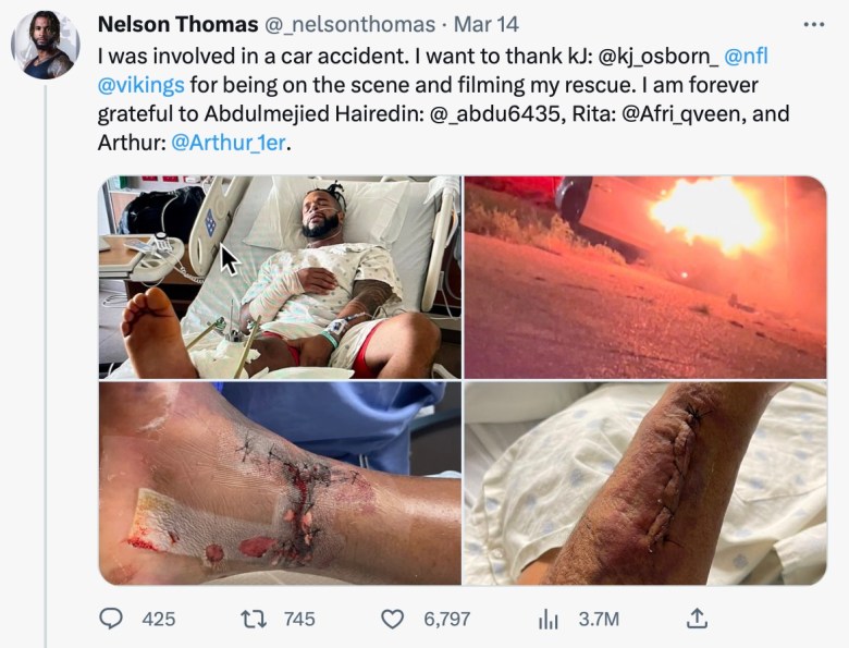 Nelson Thomas Rescued From Fiery Crash by Vikings Wide Receiver KJ Osborn