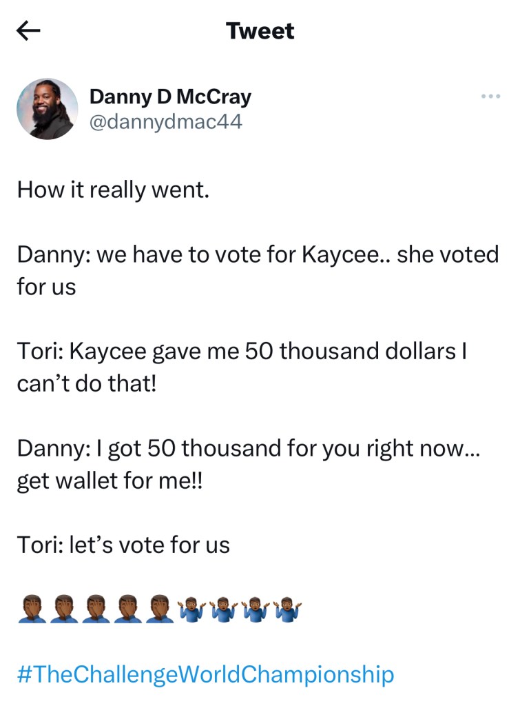 Apparently, the conversation we saw on the episode wasn’t even half of the discussion. Tori insisted she had to protect Kaycee because Kaycee gave her $50,000 after winning Spies, Lies and Allies.