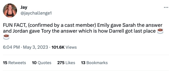 On Ride or Dies, we saw people like Turbo, Tamara, Jay, and Michele go home early because the audience helped their opponents during eliminations. Then, on the World Championship, we saw Tori give Jordan very clear clues during Lock, Stack & Barrel (telling him to pay attention to details when picking up the frowning sun). When Bananas discovered his allies weren’t funneling answers to him, he was upset.