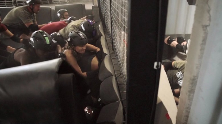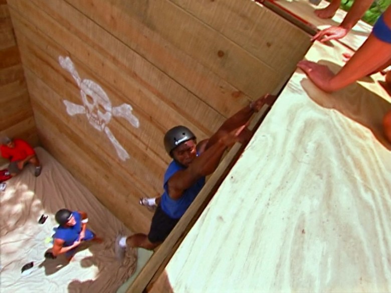 This competition required teams to escape from a pit by any means necessary. While they were able to get the majority of the team out by climbing on each other and using cheerleading strategies, the final couple of people needed to think outside the box. The veterans failed, but climbing master Alton figured out how to get it done.